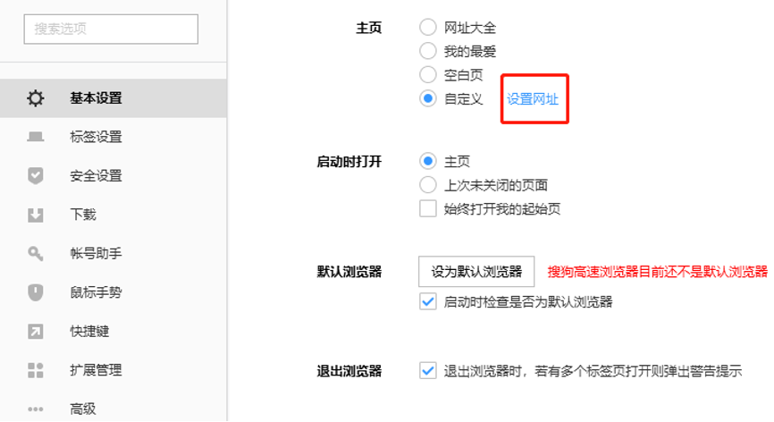 3、进入设置界面可以看到“基本设置”选项这里有一个“主页设置”。把主页设置为你想要的网址。然后设置浏览器启动时选中“打开主页”。